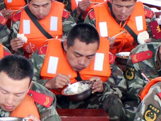 董翔(圖中)和戰(zhàn)友在大堤上吃飯。