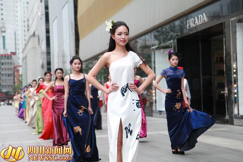 她們的突然出現(xiàn)讓路人紛紛駐足觀望,并拿出手機(jī)拍照。記者注意到,這群美女模特的服裝以“中國風(fēng)”為主,并將唐詩宋詞用毛筆書寫在衣服上,古典優(yōu)雅、中國風(fēng)十足。