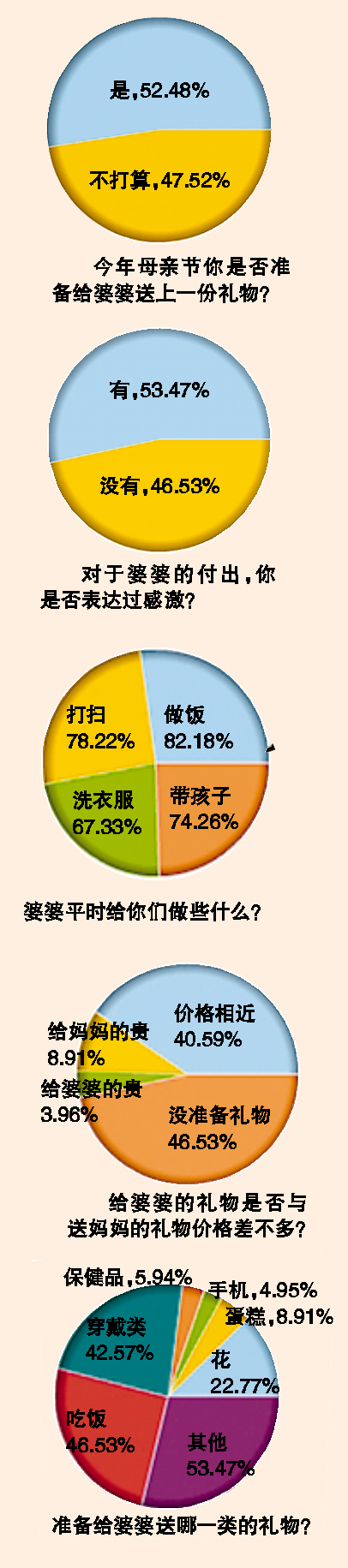 這個(gè)周日就是母親節(jié)了,很多人都在忙著給媽媽準(zhǔn)備禮物。然而本報(bào)日前發(fā)起的一項(xiàng)網(wǎng)絡(luò)調(diào)查問(wèn)卷卻顯示,僅一半的受訪者打算給婆婆送母親節(jié)禮物,同樣有近一半受訪者也從未對(duì)婆婆的付出表達(dá)過(guò)感激。