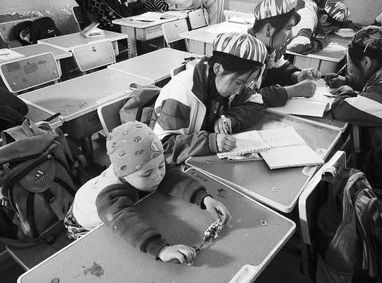 有時(shí)候?qū)W習(xí)成績(jī)好的女學(xué)生會(huì)幫助老師帶孩子,或是帶著自己的弟弟、妹妹到班里一起上課。 麥爾旦·吐拉江/攝