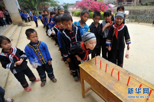在廣西百色市凌云縣伶站鄉(xiāng)弄新小學,學生們參與“吹蠟燭”游戲(2013年5月31日攝)。