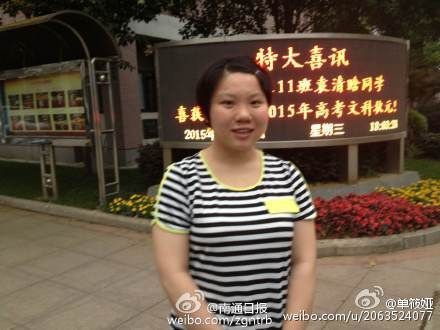 2015年江蘇高考文科狀元花落南通。 南通中學高三(11)班袁清晗同學以418分成為江蘇文科狀元。 2015年山東高考理科狀元出自山東嘉祥一中。 山東嘉祥一中賈晶同學以726分裸分加5分省級三好學生加分,總分731分成為山東理科狀元。