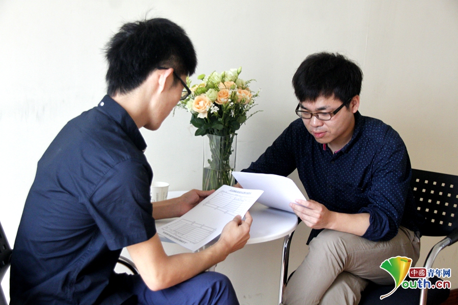 韓曉龍和合伙人討論最近開展項(xiàng)目的詳細(xì)計(jì)劃。中國(guó)青年網(wǎng)記者 郭文靜 攝