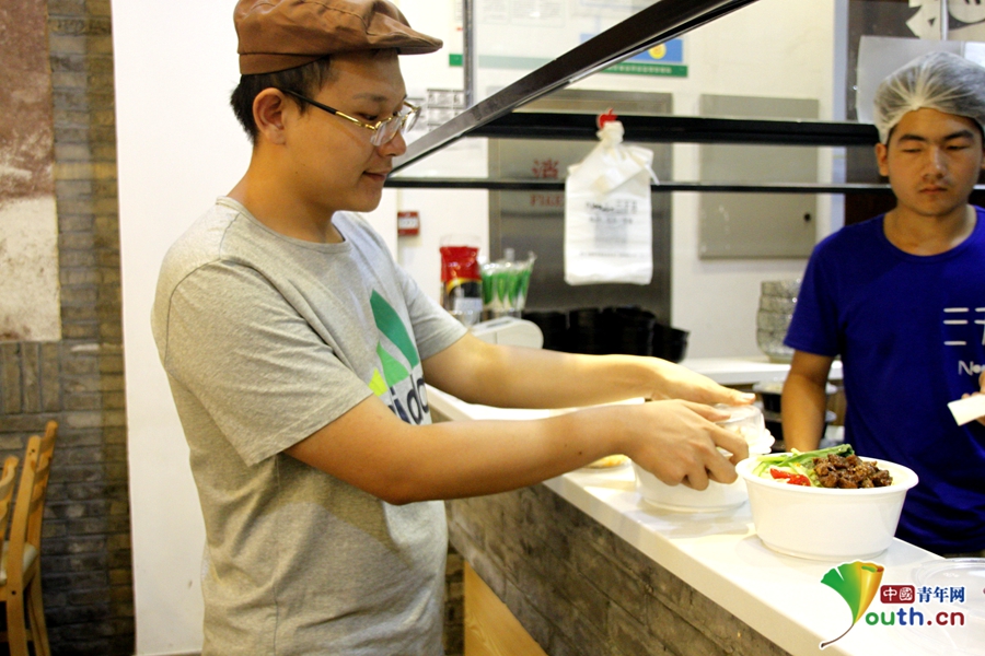 準(zhǔn)備食材、切配、為午飯高峰做準(zhǔn)備,飯點過后添置原材料,晚上打掃整理打烊。面館開業(yè)頭四個月里三人每天只能睡三個小時,正是在大家的共同努力下,小店第一個月的收入高達(dá)30萬元。中國青年網(wǎng)記者 王婧 攝
