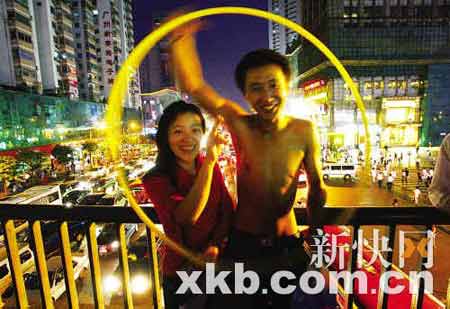 以呼啦圈為月亮,以大塞車為背景拍照留念。