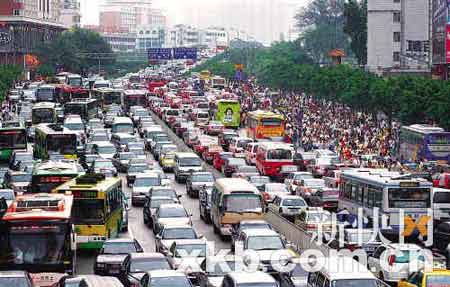 路給堵滿了,車上也同樣爆滿。昨天下午3時(shí)一刻,記者在天河路體育中心、崗頂一帶觀察,所見到的234、289、296等多路公交車,車廂里的人都擠得前胸貼后背。