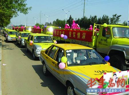 上午9時(shí)30分,記者在即墨城區(qū)新興路看到,由一輛輛轎車、大貨車及客車組成的迎親車隊(duì)浩浩蕩蕩,車身上掛著彩帶、大紅花及“百年好合”、“心心相印”等字樣,大貨車上還載著演奏隊(duì),喜慶的音樂此起彼伏,引得路人紛紛駐足觀看。記者注意到,這些車大部分都是教練車,而駕駛教練車的是清一色的教練員。不久,一輛寶馬車帶領(lǐng) 9輛豪華車駛過來,據(jù)知情人介紹,駕駛寶馬車的新郎官是某駕校的校長。記者看到,10輛豪華車組成的車隊(duì)在前,再加上后面的教練車,整個(gè)車隊(duì)排出 300多米遠(yuǎn)。