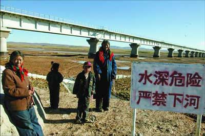 7月,雨季,沱沱河干枯的河床上一條黃毛狗在奔跑,不見寬廣河面,不見奔騰的河水,大地被烈日灼烤,裸露的河灘將水流分成幾股向東遠(yuǎn)去。全長1389.6米的長江源特大橋橫跨河上,橋北是江澤民題詞的“長江源環(huán)保紀(jì)念碑”,橋南一塊警示牌字跡清晰,上面寫著:“水深危險,嚴(yán)禁下河!