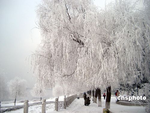 十一月二十一日早,吉林市出現(xiàn)了今冬首場霧凇奇觀。松花江上薄霧環(huán)繞,江邊垂柳被冰晶緊緊纏住,長堤旁、街路邊,一片銀裝素裹。 中新社發(fā) 蒼雁 攝