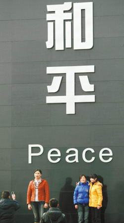 昨日,南京大屠殺紀(jì)念館,參觀者拍照留念。劉莉 攝
