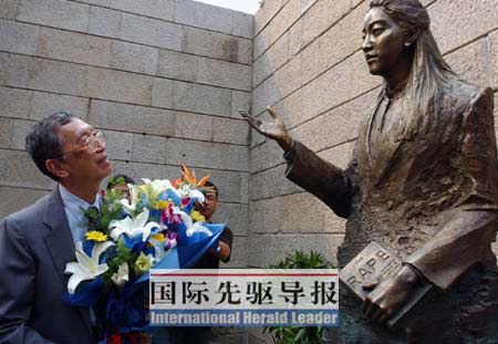 2005年9月9日,張紹進(jìn)向位于南京大屠殺遇難同胞紀(jì)念館祭奠廣場的張純?nèi)玢~像獻(xiàn)花。