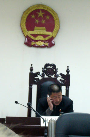 更讓人意想不到的是,原告正在作陳述時,審判庭上響起了悠揚的手機鈴聲。循聲望去,只見審判長已把手機掏出來開始通話,通話時間近1分鐘。被告幾次抬頭看到審判長根本沒有聽自己的陳述,“知趣”地停下來,庭審因而出現(xiàn)了短暫的中斷。據(jù)了解,在當?shù)匾恍┛h級法院,這種庭審怪象并不罕見。