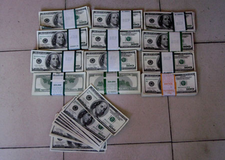 2007年12月29日10時(shí)許,偵查員又將交易地點(diǎn)定在昆明市翠湖南路某賓館。當(dāng)日10時(shí)30分許,方某帶著假美元終于出現(xiàn)。在拿到錢后,毫無(wú)防備的方某正準(zhǔn)備走出房門時(shí),被埋伏在周圍的6名偵查員當(dāng)場(chǎng)摁住。經(jīng)過清點(diǎn),現(xiàn)場(chǎng)查獲面額100元的假美元共計(jì)1246張,按市值估量,相當(dāng)于人民幣91萬(wàn)多元。