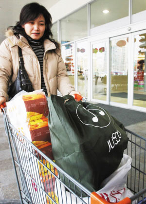 據(jù)佳世客所屬的公司青島永旺東泰商業(yè)有限公司營(yíng)業(yè)企劃部李課長(zhǎng)介紹,公司2007年11月8日推出“購物袋自帶運(yùn)動(dòng)”,首批印制了3萬個(gè)尼龍綢布環(huán)保購物袋,在東部購物中心及黃島購物中心同時(shí)推出,免費(fèi)發(fā)放給積分卡會(huì)員,非會(huì)員如需購買,每個(gè)布袋按成本價(jià)12元銷售。據(jù)統(tǒng)計(jì),截至去年年底,共發(fā)放了2萬多個(gè),平均每天發(fā)放300多個(gè)。而從統(tǒng)計(jì)數(shù)字也可看出,這些環(huán)保購物袋的使用頻率非常高,自發(fā)放日起至當(dāng)月月底,共有2700人次使用,而截至12月底,共5000余人次使用。