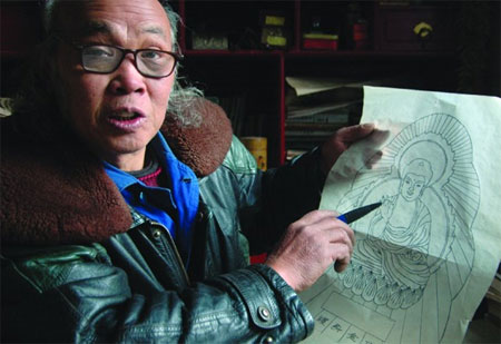 這位老人是洛陽的退休干部史洛生!懊坊ㄡ,這可是武俠小說中常用的暗器!笔仿迳蛱旄浾咭灰娒,就給記者找出一枚針,“你看這和普通的繡花針有區(qū)別沒?梅花針的針尾較重,主要靠投擲傷人。你別小看武俠書里寫的兵器,其實古代都曾有過,我造的也多是經(jīng)過考證的。”“平日金庸的武俠小說我可沒少看!”史洛生老人爽朗地笑了笑,拿出一幅“護身金佛”短兵器圖紙,講起了他造兵器的歷史。