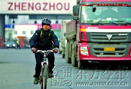 昨日中午12時(shí)20分,鄭州北郊黃河大橋收費(fèi)站,當(dāng)一個(gè)戴著頭盔身背大包的小伙子騎著自行車駛出收費(fèi)站時(shí),早已在此等候的親朋好友發(fā)出一陣歡呼:高富松是全程騎著自行車從北京返回鄭州的,這么惡劣的天氣,這個(gè)從未受過相關(guān)訓(xùn)練的年輕人用了一周才走完。