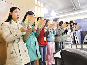 1月30日早上9時,東莞市東城區(qū)一家寫字樓內傳出了朗朗的讀書聲。幾十名員工站在一起大聲誦讀《弟子規(guī)》。這一寫字樓里出現(xiàn)的奇特場景源于公司的一項規(guī)定:每天早上9時到9時15分,所有員工都要讀書15分鐘的國學經典。