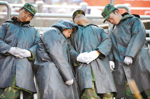 “真是太不好意思了!”下午4點(diǎn)25分,在該部二連會議室,記者見到了4名戰(zhàn)士的“廬山真面目”。面對記者的追問,他們對“站著睡覺”一事表現(xiàn)得十分尷尬!白鳛榘嚅L骨干,我們更愿意將自己威武剛毅的形象展現(xiàn)給人民群眾,可是由于已經(jīng)連續(xù)奮戰(zhàn)了39個小時,確實(shí)累得沒有辦法。從到火車站執(zhí)行任務(wù)開始,背包都沒有打開過!秉S金華說。
