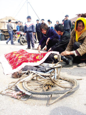中午12時許,記者趕到現(xiàn)場看到,被撞身亡的女老師王格香伏在自行車上已經(jīng)血肉模糊,她的家人圍坐在一起痛不欲生,十多名交警正在現(xiàn)場調(diào)查取證!袄蠋,你醒醒!老師,你醒醒!”面對老師的離去,十多名孩子一遍一遍呼喊著老師,站在王格香的遺體旁不愿離去!