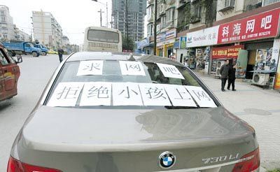 昨日下午,重慶江北南橋寺科海網(wǎng)吧門前,一輛后擋風(fēng)玻璃上貼著“求網(wǎng)吧拒絕小孩上網(wǎng)”橫幅的寶馬730轎車吸引了不少市民的眼球。原來,這是當(dāng)?shù)厍f富翁孫某開車來查看附近網(wǎng)吧是否接納未成年人上網(wǎng)。