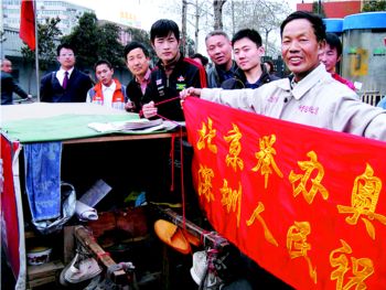2008年1月2日早6時,和家人一起吃過了早飯,李蔭桃就悄悄從深圳保安區(qū)出發(fā)了,他穿著繡有“奧運健兒加油”字樣的棉服,推著花了兩個月時間制成的木板車開始了進京圓夢之旅。李蔭桃的吃住都在這長2米、寬1米多的車里,車周圍的海報是他擋風御寒的“帳篷”;五袋子面條是他的“開葷餐”;掛在車頭的鍋是他的“移動廚房”;鋪滿一車的舊棉襖是他的“軟床”……79天走過了廣州、湖南、湖北、河南、河北五個省,每到一個陌生的城市,李蔭桃就會讓當?shù)氐拿裾只蚴蔷戎竟ぷ魅藛T在他的“記憶本”上蓋上個公章,表示“我來過了”。他還準備了一個日記本,把每天的見聞感想都記錄在上面。