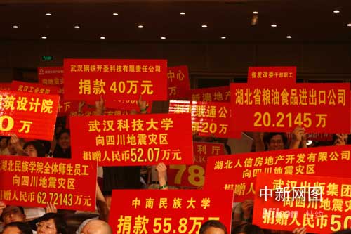 除奉獻湖北省文藝界創(chuàng)作的《我們的心連在一起》、《我們是一家人》、《別哭,孩子》、《我們一起選擇堅強》等原創(chuàng)歌曲和詩歌外,賑災(zāi)晚會現(xiàn)場先后進行了4次為災(zāi)區(qū)捐賑活動。在晚會現(xiàn)場,湖北省慈善總會、省紅十字會、中國移動、中國電信開通20部捐贈熱線,接受場外觀眾的捐贈。