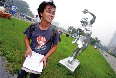 昨天上午9點40分,黎俊來到清華美院。深灰色T恤、卷邊牛仔褲、磨舊了的背包,剛下火車的黎俊看上去很有些風(fēng)塵仆仆的味道。