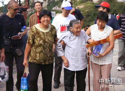 圖為來自山東聊城的九十一高齡的老奶奶在家人的攙扶下從南天門一步步走向泰山之巔。攝影 張璐