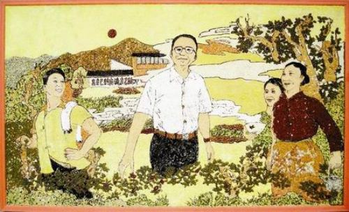 一幅用24種五谷雜糧作顏料,青川縣棗樹村15個村民用雙手一顆一顆粘貼的特色工藝畫《總理來到棗樹村》,15日已基本完成。畫作寬3.05米,高1.83米,用糧25公斤,真切表達了棗樹村村民的濃濃情意。