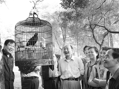 昨日上午,記者在解放公園2號門附近的樹林看到,這只羽毛黑亮的鷯哥,養(yǎng)在一只漂亮的鳥籠中,旁邊圍滿了晨練市民!苞嵏纾σ粋”,一名婦女逗它!肮柄嵏缯娴男ζ饋恚旱么蠹液逄么笮。一名市民念:“床前明月光”,鷯哥馬上用普通話接:“疑是地上霜”。另一市民說:“唱支歌唦”,它馬上唱“學習雷鋒好榜樣,忠于革命……”圍觀市民沉默片刻,鷯哥忽然冒出一句武漢話:“說話唦”,逗得大伙又是一陣哄笑。