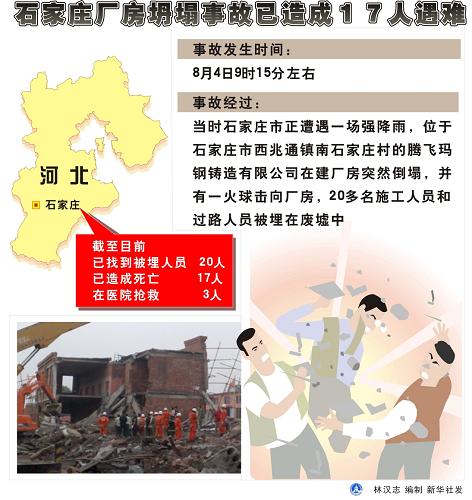 2009年8月4日。圖表:石家莊廠房坍塌事故已造成17人遇難 新華社發(fā)