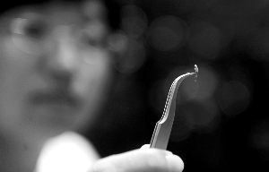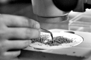 在實(shí)驗(yàn)室中,發(fā)掘人員用顯微鏡仔細(xì)觀察每一小撥細(xì)沙。