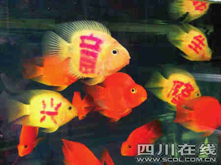 “咦,老板,你這個(gè)魚身上還有字啊?”昨日上午,市民李先生在成都青石橋?qū)櫸锸袌鲆患宜屦^內(nèi),發(fā)現(xiàn)4條白色觀賞魚的身上分別寫著“生”、“意”、“興”、“隆”,4個(gè)字組成了一幅活動(dòng)的紅字喜聯(lián)。原來,這些圖案是在魚還是幼小時(shí),用激光打在其身上的,不會(huì)掉色!拔纳眙~”作為禮品受到不少市民追捧,但也有市民提出質(zhì)疑。