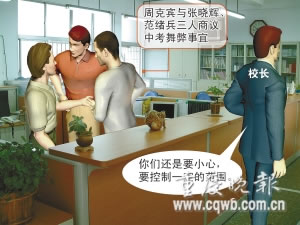 6月11日上午,中考前夕,27歲的周克賓與張曉輝、范緒兵三人商議中考相關(guān)事宜。商量過程中,周克賓提出可以抓住一些機(jī)會為學(xué)校做一點事情,即尋找機(jī)會舞弊。他雖未明說,但其他兩人都心知肚明,表示了贊成。