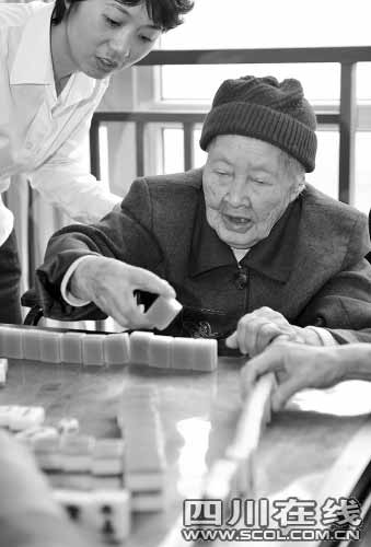 昨日上午,在成都市第一社會福利院8樓活動室里,一場麻將正打得火熱,參戰(zhàn)者都是頭發(fā)花白的老人。張鈺林老人興致勃勃地坐在旁邊觀戰(zhàn),還不時支兩招,張鈺林老人一身紅衣紅帽,顯得特別喜慶。原來,昨天是她104歲大壽,而打麻將的老人們都是她的姐妹弟兄,專門為她來祝壽的。