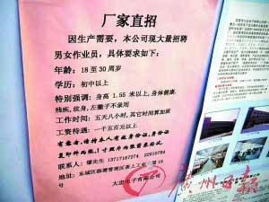 按照伍先生說法,昨日上午,記者來到大忠電子有限公司門口,在該廠門口一個(gè)招工牌上,貼著這間工廠的簡介。