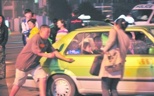 6點(diǎn)50分,一輛出租車在小龍的“護(hù)送”下駛進(jìn)廣場,還沒等車完全停下,幾個大高個子一擁而上,小龍被擠倒在地。