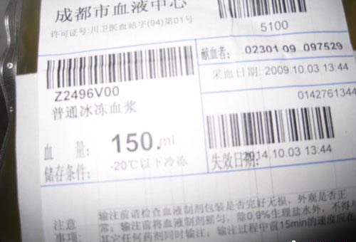 在圖片上,記者看到,血漿袋上標(biāo)注著:成都血液中心、普通冰凍血漿、血量150“1、獻(xiàn)血者的編號(hào)等基本信息。令網(wǎng)友最為氣憤的是,血漿袋上標(biāo)明的采血日期為:2009年10月3日13時(shí)44分,失效日期為2014年10月3日13時(shí)44分!斑@表明,血漿并未失效,仍可使用。”