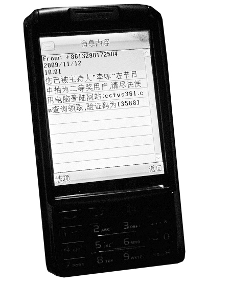“您已被主持人李詠在節(jié)目中抽為二等獎(jiǎng)用戶,請(qǐng)盡快使用電腦登陸網(wǎng)站cctvs361.cn查詢領(lǐng)取,驗(yàn)證碼為3588。”收到這條短信,沉浸在喜悅里的陜西西安市民張女士并沒(méi)有意識(shí)到,自己已經(jīng)掉進(jìn)了一場(chǎng)中獎(jiǎng)騙局。