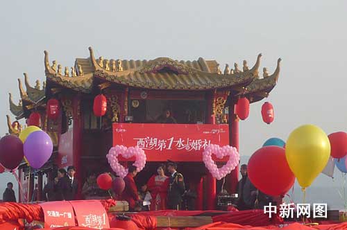 遲來(lái)的婚禮將讓姚春曉和新娘終身難忘。今天的水上婚禮在一條浪漫的畫舫上進(jìn)行,畫舫的周圍還簇?fù)碇?00艘掛滿紅燈籠的劃船,儼然像是被紅綢包裹著的白堤。