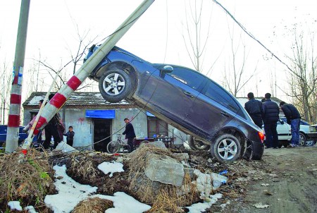 11月22日16時(shí)許,山東省巨野縣職業(yè)教育中心北50米拐角處,一輛小轎車(chē)爬上了線桿的斜拉線。據(jù)附近居民介紹,當(dāng)時(shí)轎車(chē)準(zhǔn)備自西向南轉(zhuǎn)向,因避讓逆向駛來(lái)的車(chē)輛而出現(xiàn)了意外,先是撞斷了一根線桿,緊接著爬上了另一根線桿的斜拉線。(黃體軍 楊斌 閆成帥 攝影報(bào)道)