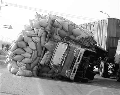 當(dāng)天下午2時(shí)30分,一輛滿載著成袋稻谷的機(jī)動(dòng)車由于超載,正晃晃悠悠地向前行駛,當(dāng)車行駛到新牛公路距離崗埠農(nóng)場(chǎng)大約100多米處時(shí),由于車上的貨物全部集中到一側(cè),整個(gè)機(jī)動(dòng)車頓時(shí)不堪重負(fù),車身迅速傾向一邊,一下子造成車身無(wú)法控制,只聽(tīng)到“嘩啦“一聲,車上的貨物,全部翻向公路,幾分鐘后,車上的兩名駕駛?cè)藛T,奮力推開(kāi)已經(jīng)開(kāi)始變形的車門,慌忙從駕駛室爬了出來(lái)。