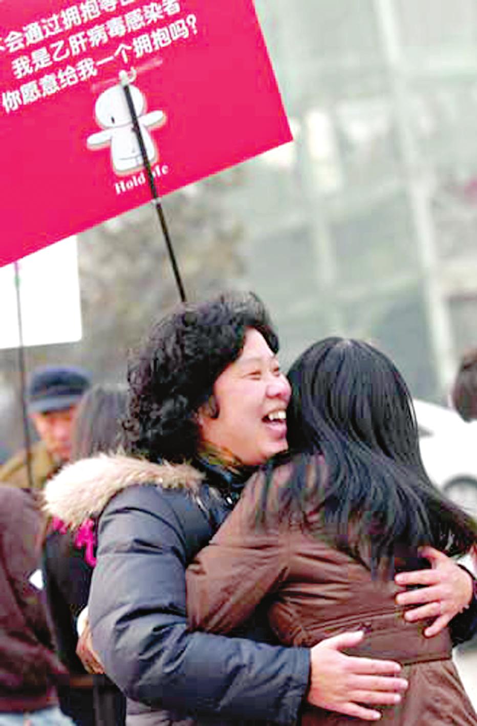 2009年1月4日,張雯(右 )在鄭州最繁華的二七廣場向陌生人索要擁抱消除對乙肝患者的社會(huì)歧視 受訪者供圖
