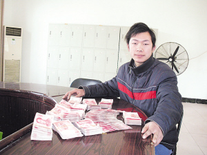 據(jù)悉,柴圣恩今年21歲,高中畢業(yè)后一直在上海打工。眼看春節(jié)快到了,他便提前回徐州老家過節(jié)。由于離過節(jié)還有一個多月,他便通過朋友到徐州新世紀(jì)裝飾城找了一份蹬三輪車送貨的雜工,給人送貨賺錢,工資一個月700元。當(dāng)記者問其撿到巨款后,有沒有“心動”時,柴圣恩說:“雖然工資不高,但老板對他不錯,我覺得還是靠自己的力氣掙錢比較踏實。”