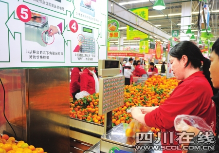 余女士是成都?xì)W尚超市高新店的?,最近她在該超市買水果時(shí)意外發(fā)現(xiàn),超市推出了一種自助磅秤操作系統(tǒng)。根據(jù)這個(gè)系統(tǒng),顧客可以自己為所買的散裝水果過秤,省去了到人工過秤的地方排隊(duì)。昨日上午,記者來到歐尚超市高新店水果專區(qū),只見超市在過道里放了一個(gè)很大的提示牌,上面用箭頭和圖像清楚地告訴顧客,如何使用這個(gè)自助磅秤操作系統(tǒng)。如果超市工作人員忙不過來,顧客就可以按照提示自己過秤。