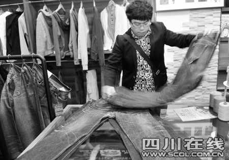 前日下午,“養(yǎng)牛人”之一的“豪豬”穿著一條已經(jīng)“養(yǎng)”了兩年的牛仔褲從北京回到成都。作為成都“養(yǎng)!钡南闰(qū)者,27歲的他已經(jīng)“養(yǎng)!3年,現(xiàn)在手中有7條“!。說起自己的“!,“豪豬”立即搬出了4條牛仔褲。“這條是‘養(yǎng)了’3個月的,這條半年!焙镭i說,“接下來這條一年,最后就是兩年的。”豪豬拿起“養(yǎng)”了一年的褲子,褲子后袋部位上一個T字形十分明顯。這個是他在其他牛友的啟迪下,將一個小方盒裝在后袋內(nèi)一個月磨出來的!斑能塞貓爪形狀的玩具,花紋酷酷的ZIPPO打火機(jī),很Q吧?”