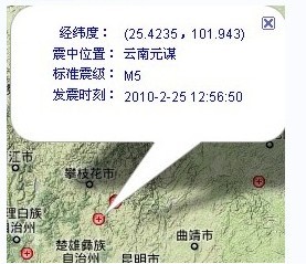 云南網(wǎng)快訊 據(jù)云南地震臺(tái)網(wǎng)測定,2010年2月25日12時(shí)56分50秒,在25.4N,101.9E,在楚雄州元謀縣羊街鄉(xiāng)發(fā)生M5.1級(jí)地震,震源深度16KM。據(jù)網(wǎng)友反應(yīng),昆明、安寧等地均有強(qiáng)烈震感,目前暫無人員傷亡報(bào)告。云南網(wǎng)記者目前正趕往災(zāi)區(qū),本網(wǎng)將繼續(xù)同步跟進(jìn)地震最新情況。