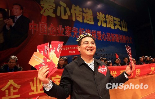 資料圖:2010年2月5日,被稱為“中國首善”的江蘇黃埔再生資源利用有限公司董事長陳光標,攜由46名愛心人士組成的中國企業(yè)家光標榜樣愛心企業(yè)團抵達新疆烏魯木齊,并在新疆財經(jīng)學院為來自烏魯木齊、伊犁、石河子、和田、塔城、克拉瑪依等地的1000名貧困青少年發(fā)放紅包。中新社發(fā) 劉新 攝