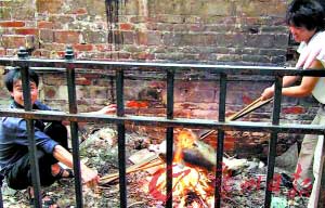 從圖片中可以看出,兩名烤狗的男子分別穿著藍(lán)色和白色襯衫。兩人用繩子將狗的四條腿綁住,拴在一根木棍上,然后架在柴火上烤。而“烤全狗”的地點(diǎn)發(fā)生在一堵爛墻根下,墻根下還有不少磚塊和瓦礫。這組圖片也清晰地展示了整個(gè)烤狗的過程,最終這只狗被烤得黑中帶黃。