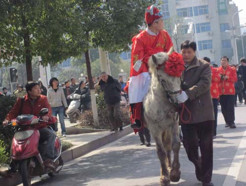 昨日,一場別致的復(fù)古婚禮在芙蓉區(qū)嘉雨路上演,新郎沒有像其他年輕人用豪華車隊迎娶新娘,而是騎著高頭白馬抬著大紅花轎,把新娘子娶回家。